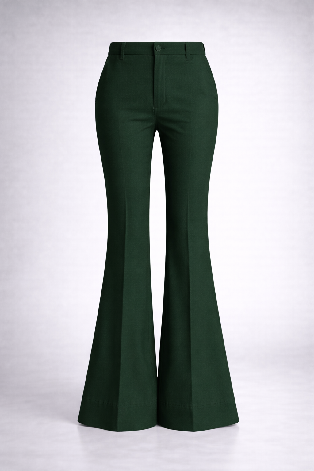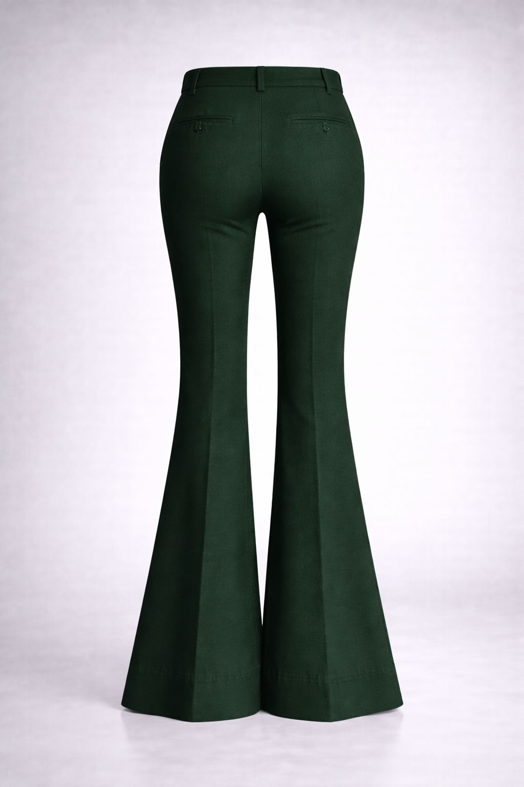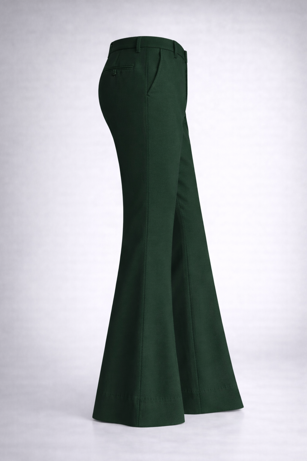The rich forest green color adds depth and sophistication, making these trousers a standout choice for stylish and formal occasions. The flared-leg design creates a distinctive silhouette that offers both comfort and modern flair while maintaining a polished appearance.